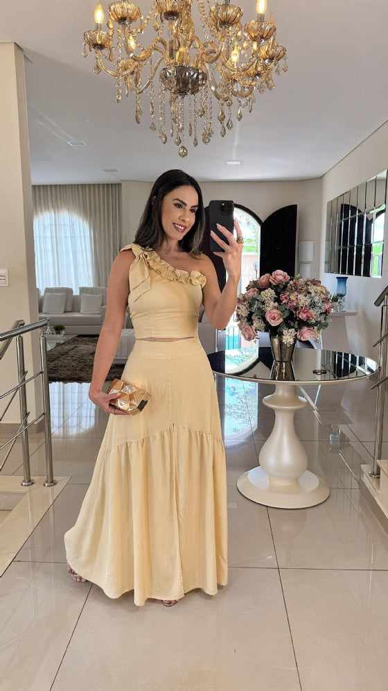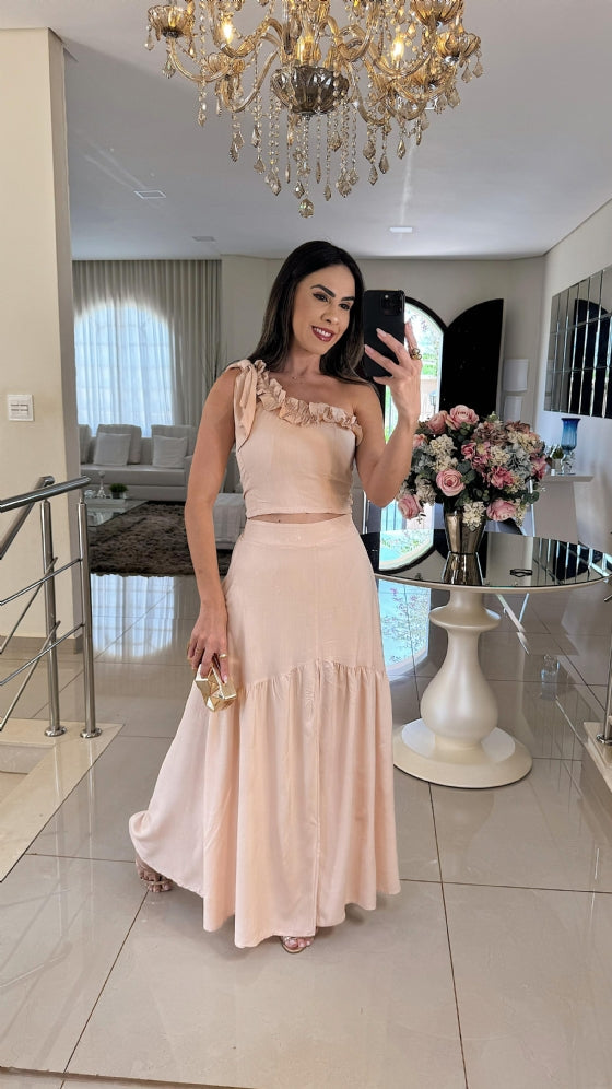 O Conjunto Aurea é a combinação perfeita de leveza e estilo. Feito em tecido de viscose, é composto por uma saia com elástico na parte traseira e uma charmosa fenda frontal, além de um cropped com bojo, que garante conforto e um ajuste impecável. Essa peça é ideal para quem deseja um look sofisticado e prático.
