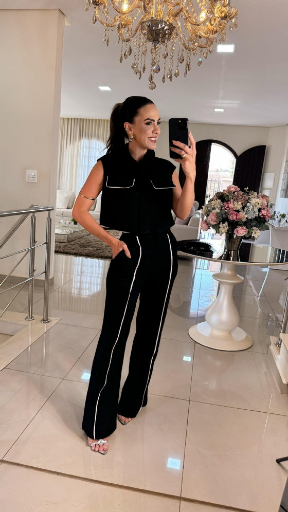 O Conjunto Marjorie é a escolha perfeita para quem busca estilo e sofisticação. Composto por uma calça pantalona com fechamento em zíper, oferece um caimento impecável e moderno. A blusinha cropped soltinha, com um delicado detalhe de listra branca, completa o conjunto com um toque casual e elegante. Um conjunto dos sonhos para arrasar em qualquer ocasião!